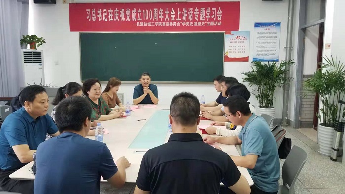 7月10日,为把学习贯彻习近平总书记“七一”重要讲话精神不断引向深入,民盟盐城工学院基层委员会召开专题学习会议。会上,在深入学习讲话内容后,与会盟员畅谈各自体会与感悟。大家纷纷表示,习总书记的讲话高屋建瓴、意义深远。站在两个一百年的历史交汇点上,“七一”讲话给了大家自信与自豪——这是对中国特色社会主义制度的自信,是对作为一个中国人的自豪。作为盟员,将结合工作实际,从“学、思、践、悟”四个方面,深入贯彻习总书记“七一”重要讲话精神,做信仰的守望者、时代的奋进者、人民的服务者。