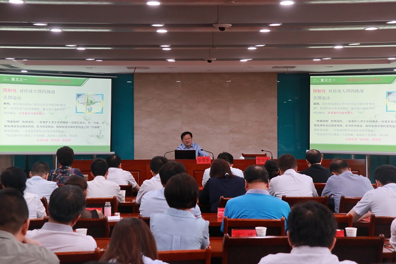 校九三学社支社主委、盐城市党外人士智库成员侯贵华教授应邀作“碳达峰,碳中和——挑战与机遇并存的未来之路”主题讲座。侯贵华从我国实现碳达峰和碳中和的背景意义、当前现状、相关政策、解决路径与方法等方面,进行了全方位的讲解,并就我市实施碳达峰、碳中和目标分析了盐城区位优势和产业优势,为我市有关企业实现绿色发展提出建议。通过学习,大家认为本期“专家讲坛”紧密结合盐城推进能源结构、产业结构、交通运输结构、用地结构调整,促进经济社会发展全面绿色转型,为中国实现“双碳”目标作出盐城贡献提供了办法和思路,表示将继续围绕市委市政府加快绿色转型发展战略部署,发挥各自优势,积极担当作为,为盐城经济社会高质量发展作出新的贡献。