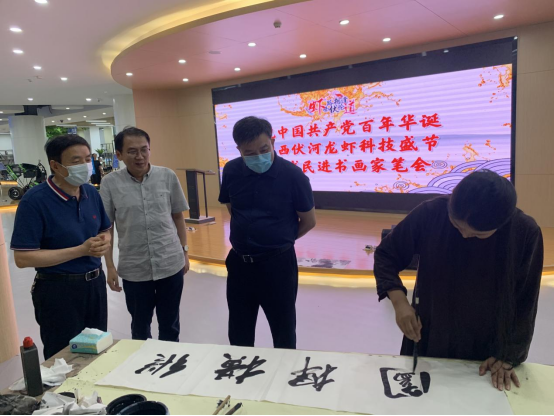 笔会现场,民进盐城市委邀请的9名会内知名书画家以建党100周年为主题,借笔墨庆祝西伏河龙虾科技节的开展,激情创作系列作品。不到一个小时,一幅幅主题突出、内容丰富的书画作品跃然纸上,书画家们以书画寄情怀,用翰墨丹青充分表达对中国共产党百年光辉历程和百年丰功伟绩的赞颂,对地方高校科技新成果的肯定。